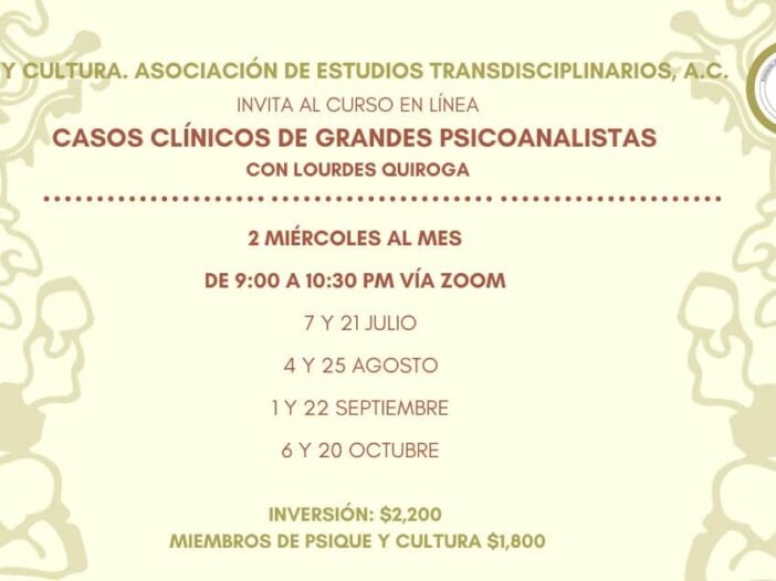 Curso en línea a través de la plataforma zoom, del día 7 de julio al 20 de octubre. Este curso abordará los casos clínicos de grandes psicoanalistas.